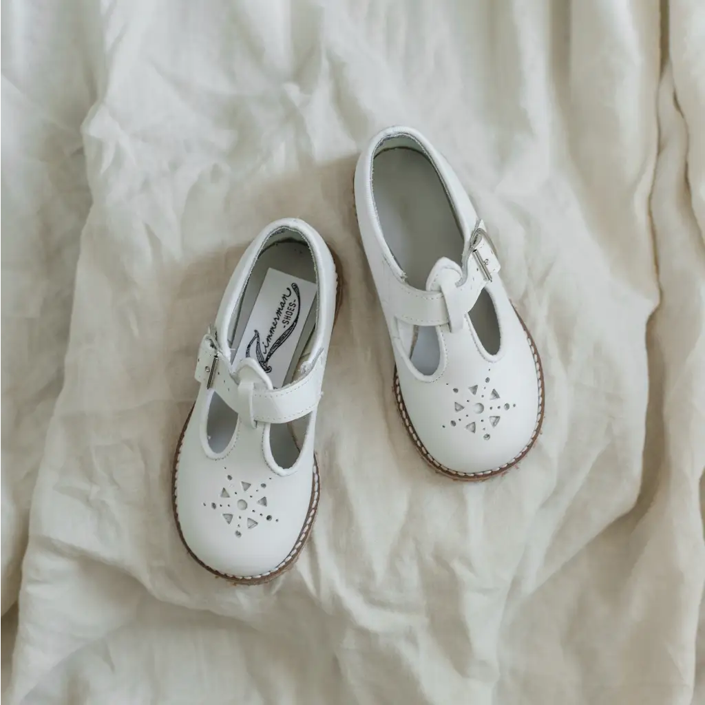 The Anna T-Strap is made of white leather and lined with breathable leather and cotton which work together to draw out any moisture. This style features an adjustable ankle strap. The structure of the shoe and the rubber sole provide stability without weight to support your child's early steps. The perfect style to dress up or down!