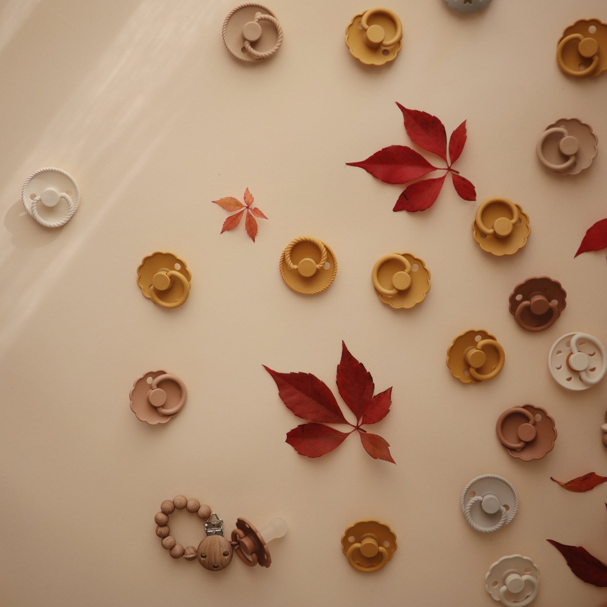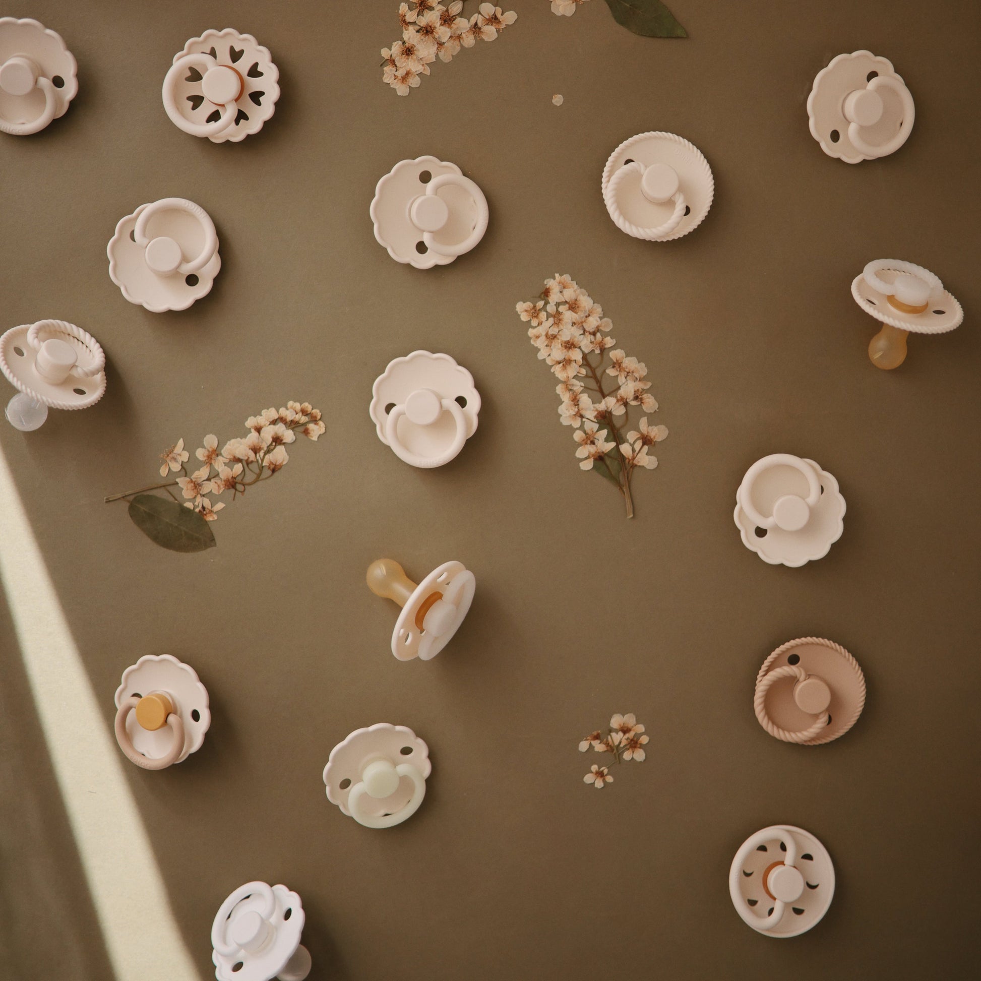 - Pacifiers are made with natural rubber and may expand with use.